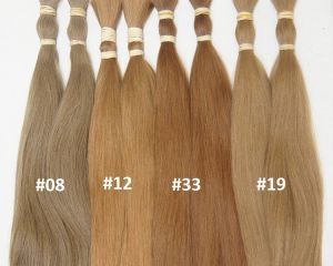 Die Extensions sind mit flachen Keratinbondings versehen und können mittels Wärmezange oder mit einem Ultraschallgerät am Eigenhaar angebracht werden. Das Remyhaar (alle Haare liegen in gleicher Wuchsrichtung) ist von sehr guter Qualität, ohne Silikone und seidig weich und füllig bis in die Spitzen. Die Haare werden in unserer Fabrik schonend gefärbt und chemisch gewellt und können auch in größeren Mengen bestellt werden. Zubehör wie Fingerschutz, Schablonen und Haarbürsten findet man auch in unserem Shop.