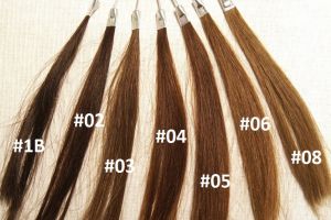 Die Extensions sind mit flachen Keratinbondings versehen und können mittels Wärmezange oder mit einem Ultraschallgerät am Eigenhaar angebracht werden. Das Remyhaar (alle Haare liegen in gleicher Wuchsrichtung) ist von sehr guter Qualität, ohne Silikone und seidig weich und füllig bis in die Spitzen. Die Haare werden in unserer Fabrik schonend gefärbt und chemisch gewellt und können auch in größeren Mengen bestellt werden. Zubehör wie Fingerschutz, Schablonen und Haarbürsten findet man auch in unserem Shop.