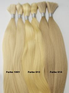 Die Extensions sind mit flachen Keratinbondings versehen und können mittels Wärmezange oder mit einem Ultraschallgerät am Eigenhaar angebracht werden. Das Remyhaar (alle Haare liegen in gleicher Wuchsrichtung) ist von sehr guter Qualität, ohne Silikone und seidig weich und füllig bis in die Spitzen. Die Haare werden in unserer Fabrik schonend gefärbt und können auch in größeren Mengen bestellt werden. Zubehör wie Fingerschutz, Schablonen und Haarbürsten findet man auch in unserem Shop.